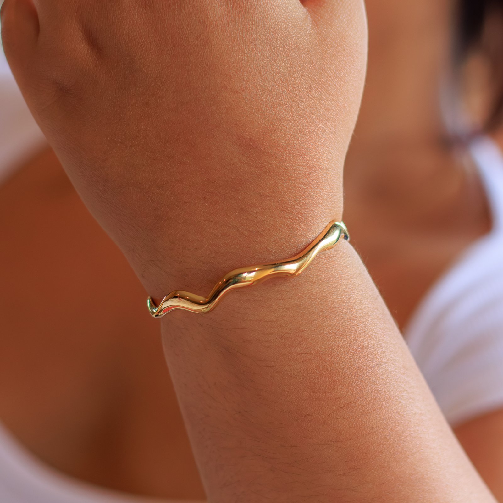 Lightweight cuff with a comfortable adjustable fit — minimal, modern and easy to layer. 18K PVD gold plated and protected against tarnish and rust; waterproof and hypoallergenic for everyday wear.